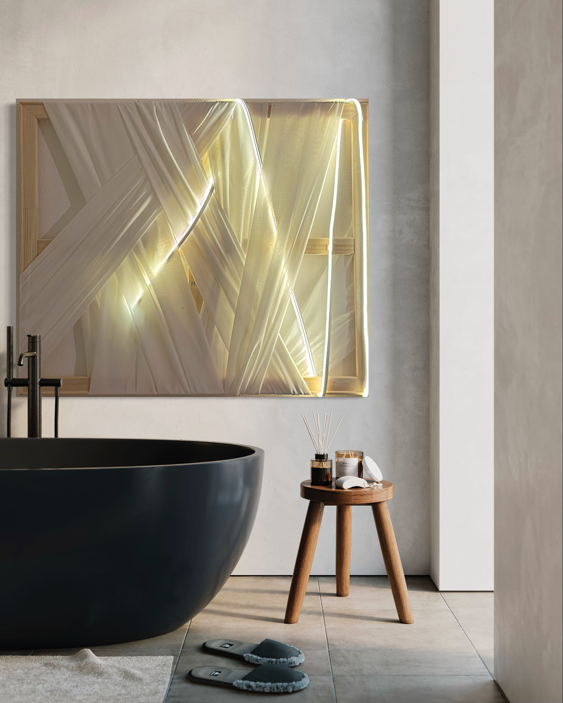 Day & Night is an evocative art piece that seamlessly weaves fabric tapestries with LED lights to represent the continuous cycle of human experience, reflecting the duality of light and shadow in our daily lives. The interplay of materials captures the dynamic transition between clarity and obscurity, symbolizing how our perceptions shift through different phases of awareness and introspection.