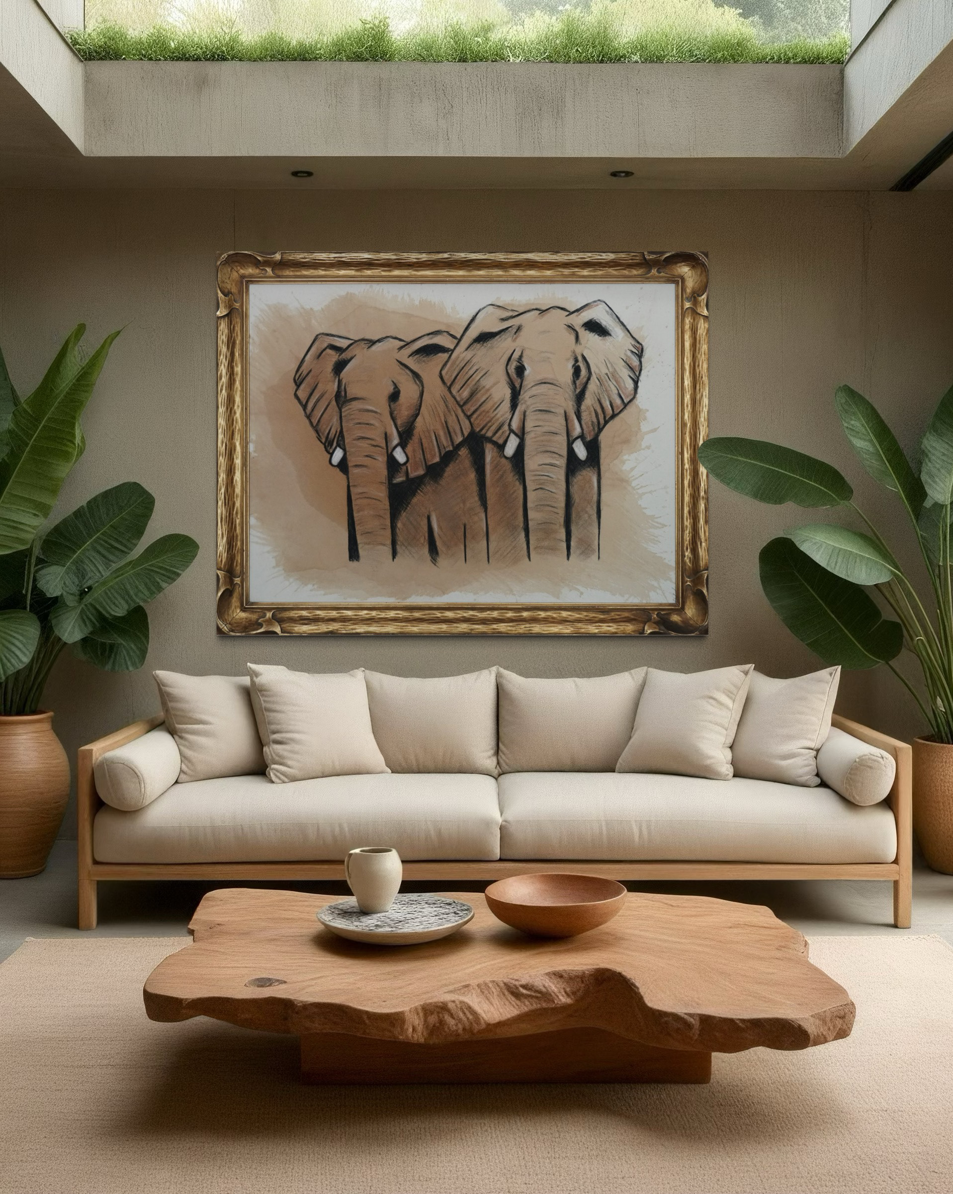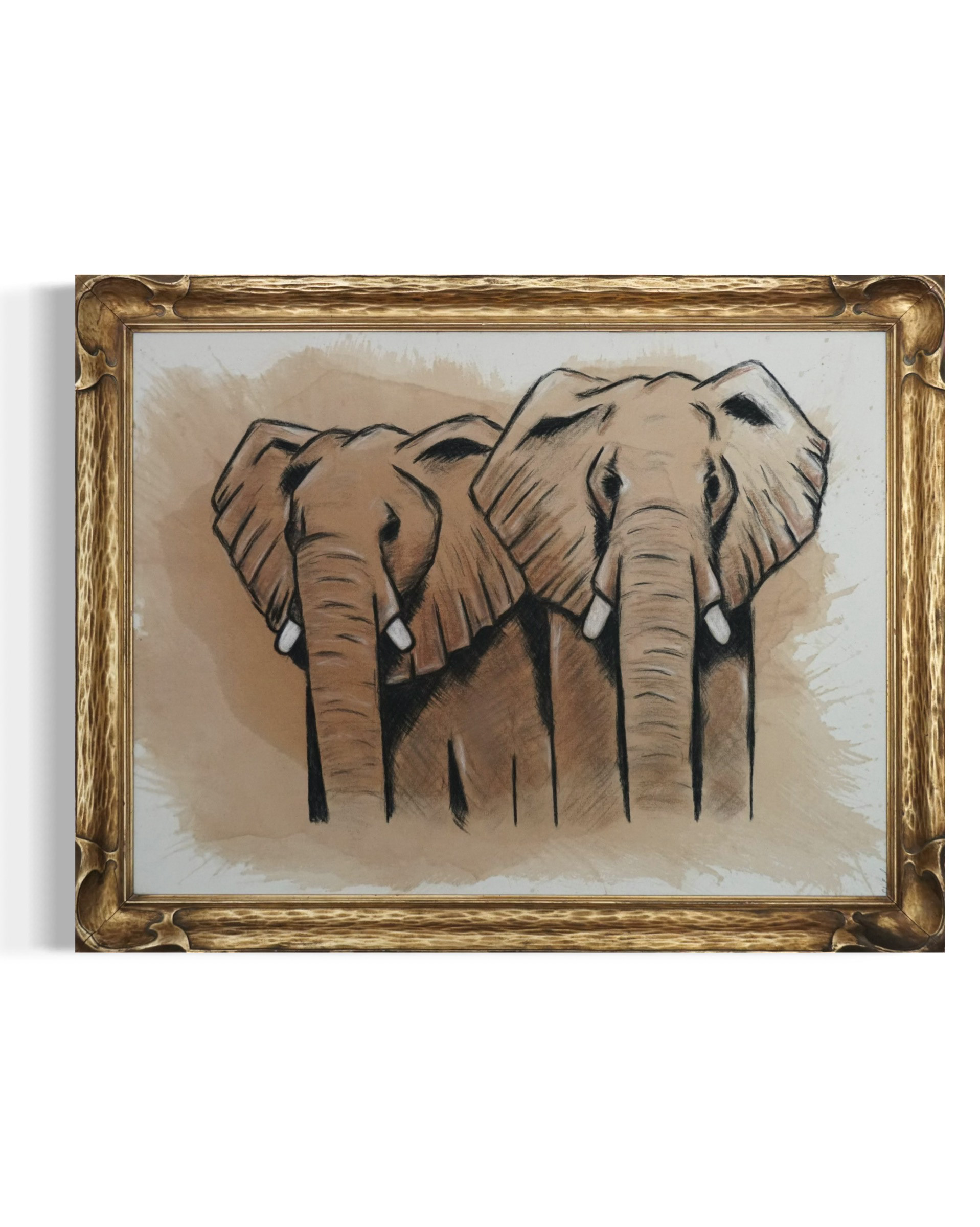 Tea for Deux was brought to life using tea to stain the canvas, and symbolizes the harmony of elephant and human energy. Both species share a profound sense of presence and emotional depth, beautifully embodied by the elephants' grounding presence in the piece. Viewers are invited to reflect on how simple moments, like the quiet introspection found in the daily ritual of enjoying a cup of tea, connect us to the broader tapestry of life, fostering a sense of harmony and shared understanding.